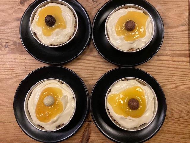 lemon curd en terug in de koelkast tot de volgende dag. Kleine eitjes erop. Ze werden heerlijk gevonden, maar het was wel te zwaar na zo'n uitgebreide maaltijd. Volgende keer kleinere maken.