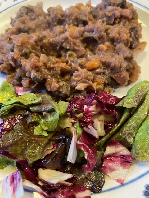 Op woensdag stamppot sla. Bij elkaar 300g sla van radicchio, witlof en little gem en verse kruiden zoals maggiplant, selderij en bieslook. Zo'n 500g aardappel gekookt met behulp van de ecostoof. In een pan met een beetje oude jus 100g gerookte spekjes gebakken, daar 1 ui en 1 teen knoflook bij gedaan. Omdat de jus en spekvet genoeg waren geen melk gebruikt. Apart een rookworst opgewarmd in de verpakking in heet water. Geslaagde maaltijd.